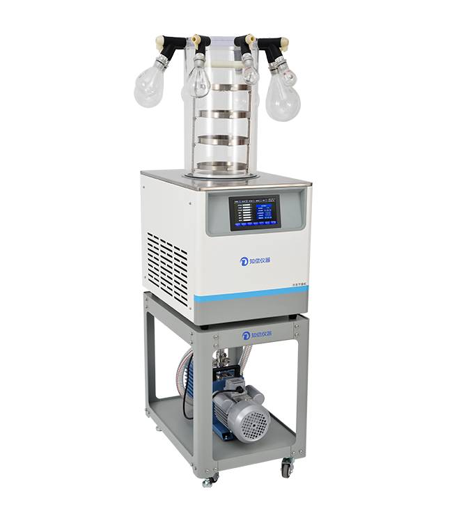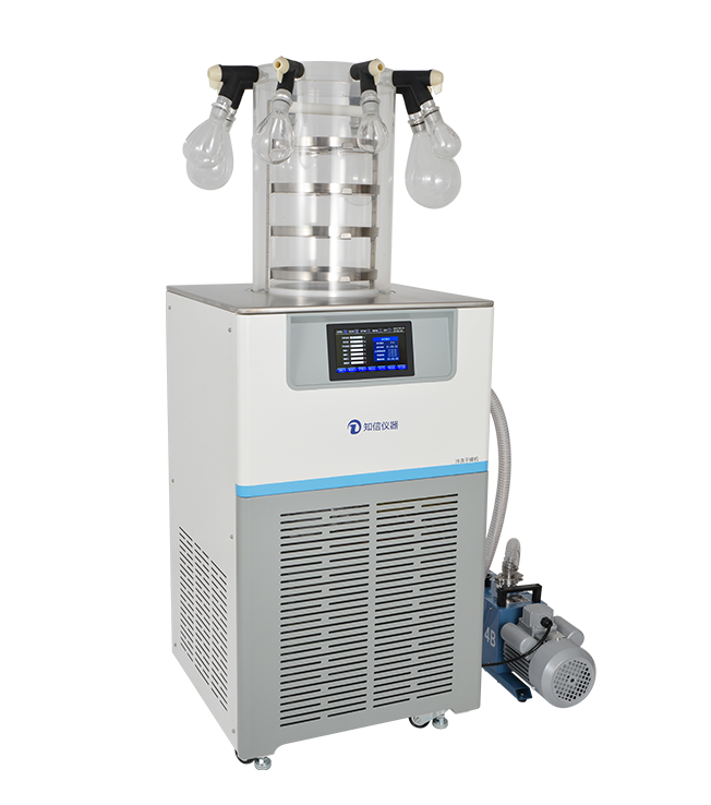 知信儀器的冷凍干燥機(jī)應(yīng)用真空泵抽真空,隔板上作為樣品的凍干,冷阱溫度分為-50,-60,-80三款,樣品可放置在冷阱中預(yù)凍,樣品在家用冰箱中預(yù)凍的效果不佳,建議使用低溫冰箱或者冷阱預(yù)凍,在凍干機(jī)中的樣品的水分升華后往下方抽真空口流動(dòng),遇冷阱低溫凝結(jié)在冷阱腔壁上,保持了隔板上樣品的干燥,在一定時(shí)間后充分干燥樣品,從而實(shí)現(xiàn)樣品的凍干。