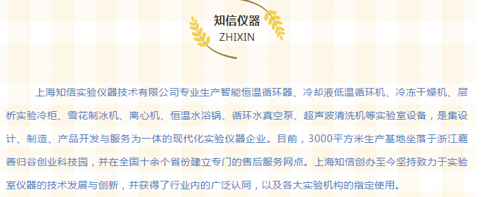 上海知信實(shí)驗(yàn)儀器技術(shù)有限公司專業(yè)生產(chǎn)智能恒溫循環(huán)機(jī)、冷卻液低溫循環(huán)機(jī)、層析實(shí)驗(yàn)冷柜、雪花制冰機(jī)、冷凍干燥機(jī)、離心機(jī)、恒溫水浴鍋、循環(huán)水真空泵、超聲波清洗機(jī)等實(shí)驗(yàn)室設(shè)備,是集設(shè)計(jì)、制造、產(chǎn)品開發(fā)與服務(wù)為一體的現(xiàn)代化實(shí)驗(yàn)儀器企業(yè)。