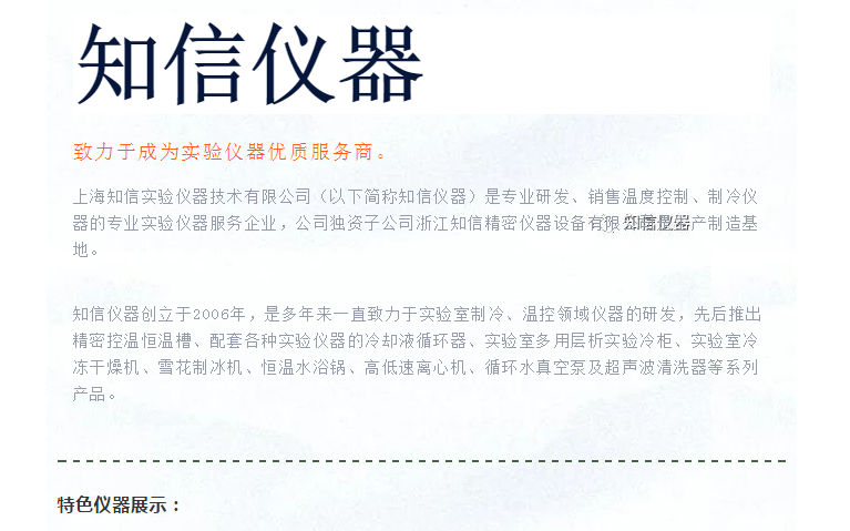 上海知信實(shí)驗(yàn)儀器技術(shù)有限公司專(zhuān)業(yè)生產(chǎn)智能恒溫循環(huán)機(jī)、冷卻液低溫循環(huán)機(jī)、層析實(shí)驗(yàn)冷柜、雪花制冰機(jī)、冷凍干燥機(jī)、離心機(jī)、恒溫水浴鍋、循環(huán)水真空泵、超聲波清洗機(jī)等實(shí)驗(yàn)室設(shè)備,是集設(shè)計(jì)、制造、產(chǎn)品開(kāi)發(fā)與服務(wù)為一體的現(xiàn)代化實(shí)驗(yàn)儀器企業(yè)。