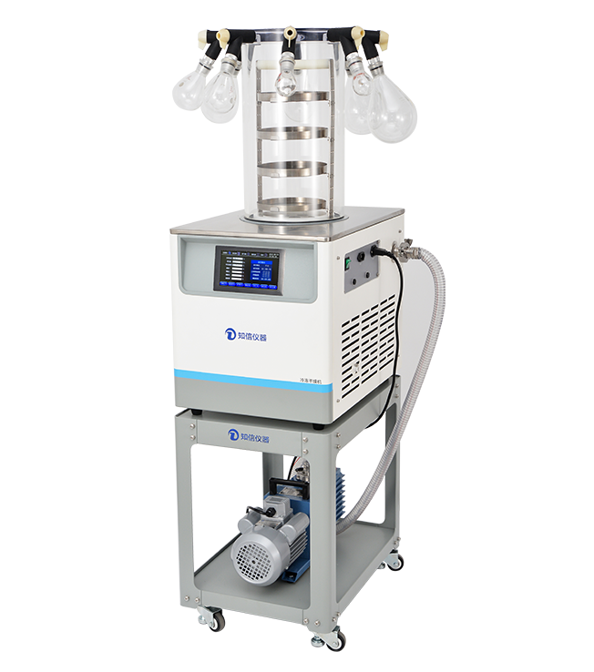 冷凍干燥機(jī)是將含水物品預(yù)先凍結(jié),然后使其水分在真空狀態(tài)下升華而獲得干燥物品的一種技術(shù)方法。經(jīng)冷凍干燥后物品理化性質(zhì)、生物特性基本不變,易于長期保存,復(fù)水后物品能迅速恢復(fù)到凍干前的形態(tài),并且能保持其原有的生化特性。因此,冷凍干燥機(jī)在化工、食品、醫(yī)藥、生物等制品的制備和檢測領(lǐng)域得到廣泛應(yīng)用。